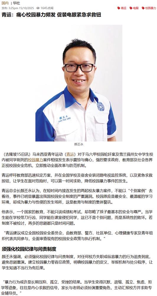 青运:痛心校园暴力频发 促装电眼紧急求救钮